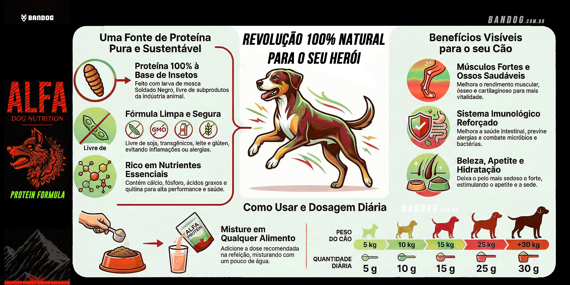A ALFA PROTEIN FORMULA é 100% extrato animal, fonte nobre, rica em elementos poderosos e benéficos à saúde, a larva da Black Soldier. Com seleção e desenvolvimento especiais, atingimos uma qualidade incomparável para saúde e performance do seu cachorro. A ALFA PROTEIN é um extrato poderoso, fonte de proteína de alta qualidade, rica em aminoácidos essenciais, cálcio, fósforo e ácidos graxos. Seu cachorro terá fortalecimento de alto rendimento muscular, ósseo e cartilaginoso. Além disso, ela contêm quitina, um polissacarídeo que melhora a saúde intestinal e o sistema imunológico do seu herói, inclusive prevenindo infecções e alergias. Outro recurso poderoso da nossa fórmula ALFA é o fortalecimento de ossos e unhas. Por conter ácido láurico, combate micróbios, bactérias e vírus. Além disso, reduz risco de doenças cardíacas.