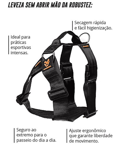 A solução para quem quer agilidade, leveza e conforto com segurança total. Um peitoral super seguro, forte e projetado para absorver impactos quando o cão puxa. Toda resultante de forças nesse peitoral se afasta do pescoço ou partes mais frágeis e sensíveis do cão.